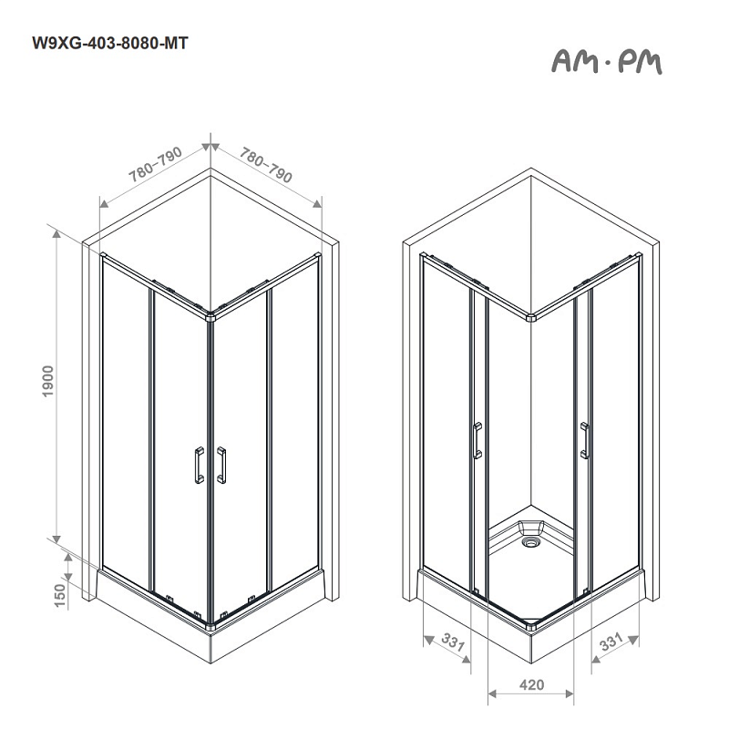 Душевое ограждение без поддона 80x80 AM.PM Above W9XG-403-8080-MT профиль серебристый