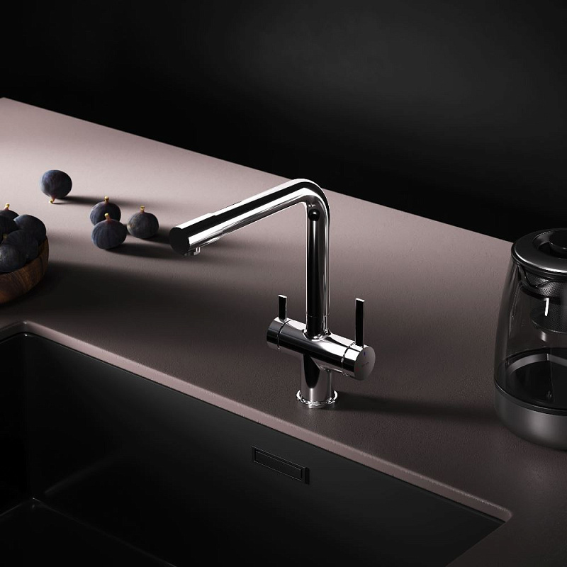 Встречайте долгожданное пополнение нашумевшей коллекции Func — кухонные смесители с оригинальными «фишками», характерными для всей коллекции. Дизайн, характерный только для премиум-сегмента, благодаря собственным дизайнерам бренда теперь представлен и в более доступной ценовой категории. Смеситель оснащён встроенным каналом для подачи питьевой воды. Чтобы получить питьевую воду, воспользуйтесь ручкой, расположенной с левой стороны корпуса; для обычной воды управляйте смесителем привычным образом. Размер (Ш/Г/В): 135x265x298 мм. Материал - нержавеющая сталь, цинк, латунь. Цвет - хром. Тип управления - однозахватный. Излив - поворотный.