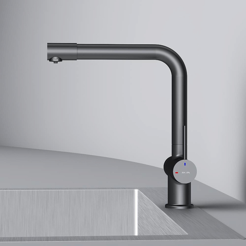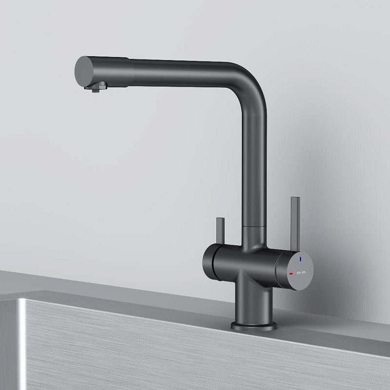 Встречайте долгожданное пополнение нашумевшей коллекции Func — кухонные смесители с оригинальными «фишками», характерными для всей коллекции. Дизайн, характерный только для премиум-сегмента, благодаря собственным дизайнерам бренда теперь представлен и в более доступной ценовой категории. Смеситель оснащён встроенным каналом для подачи питьевой воды. Чтобы получить питьевую воду, воспользуйтесь ручкой, расположенной с левой стороны корпуса; для обычной воды управляйте смесителем привычным образом. Размер (Ш/Г/В): 135x265x298 мм. Материал - нержавеющая сталь, цинк, латунь. Цвет - черный. Тип управления - однозахватный. Излив - поворотный.
