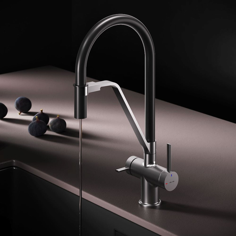 Смесители Смеситель для кухни AM.PM Func F8F07812 высокий, сатин с каналом для питьевой воды и гибким черным изливом купить в Москве.
