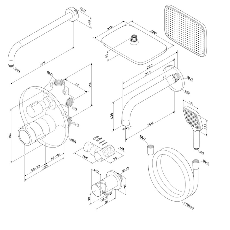 Длина душевого шланга - 1750 мм. Цвет - хром. Монтируемый в стену излив - это современное решение для экономии пространства. Длина излива составляет 204 мм. Цвет - хром. Размер смесителя (Ш/Г/В): 150x144x180 мм. Материал встраиваемой душевой системы - Латунь, Zamak, нержавеющая сталь, PPA.